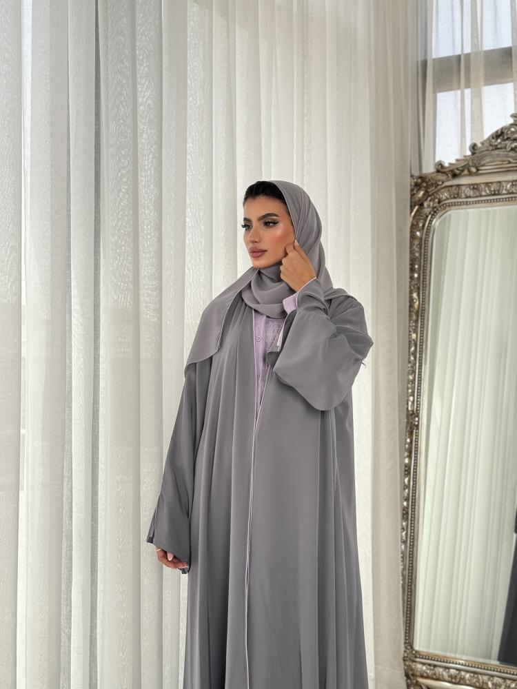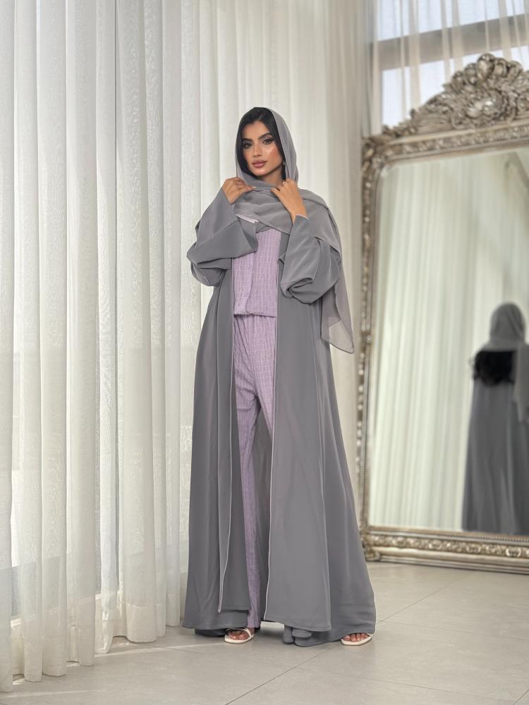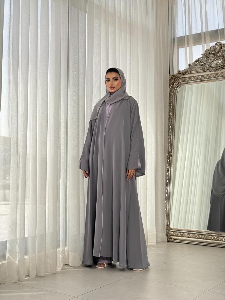 عباية نصف كلوش كريب خفيف ناعم رمادي، مع حدود حرير موف فاتح على أطراف العباية.