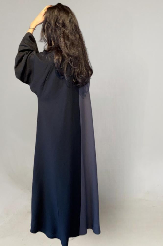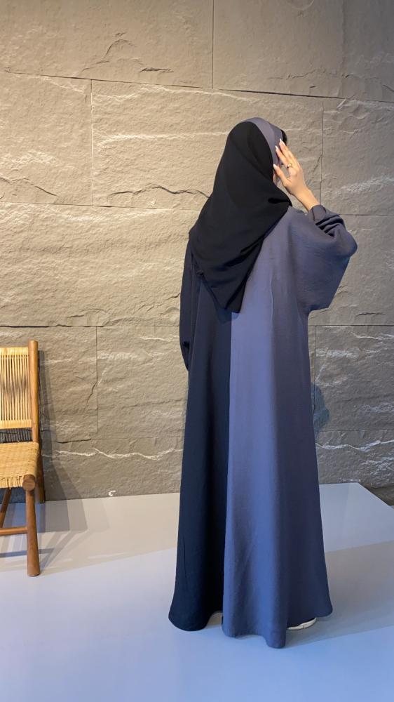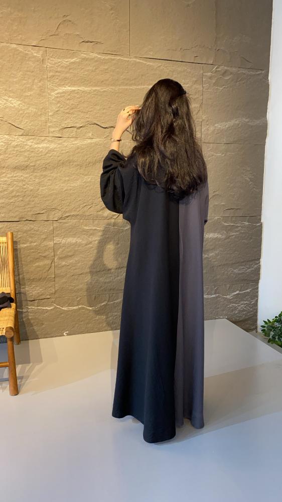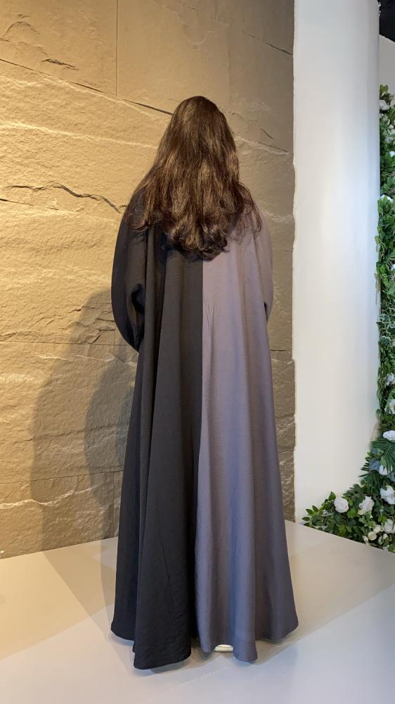 عباية نصف كلوش بقماش لينن تصميم طولي نصف أسود نصف رمادي، مع طرحة سوداء بطرف لينن رمادي عريض.